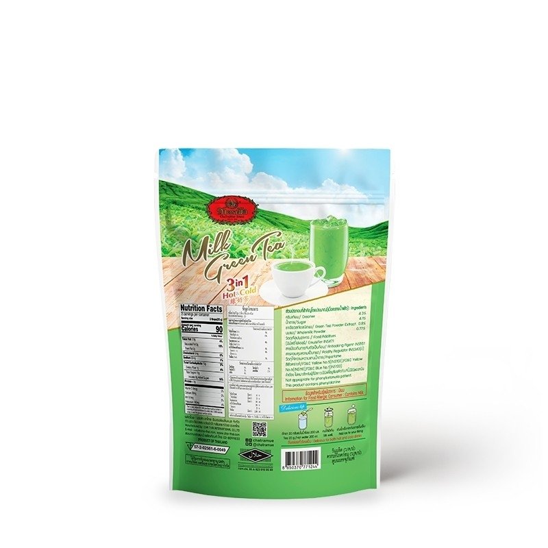 ชาเขียวผสมนมปรุงสำเร็จชนิดผง (3 in 1) รสชาติชาเขียวนมเข้มข้น ชงง่ายเพียงเทชาในซองชงกับน้ำร้อนก็สามารถอร่อยกับชาเขียวแก้วโปรดได้ทันที สดชื่นดับกระหาย คลายร้อน ดื่มได้ทั้งร้อน - เย็น